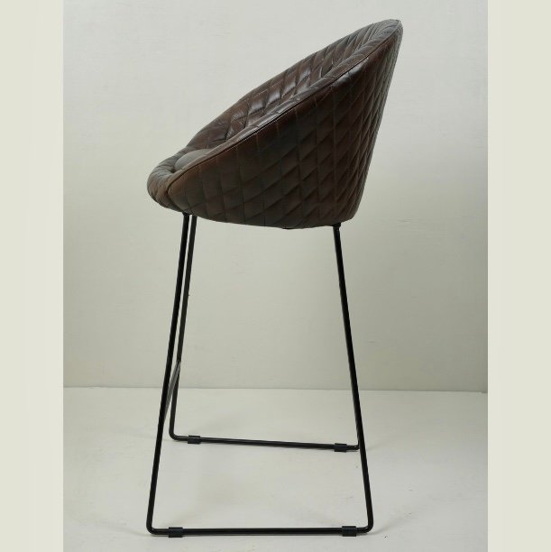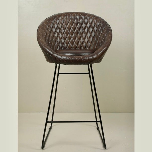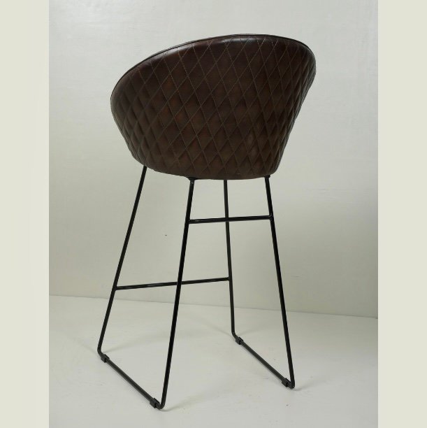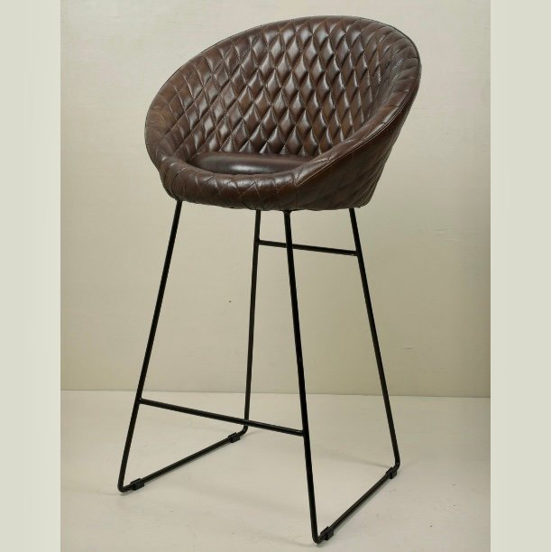 Diamond-Quilted Brown Leather Bar Chair with Sleek Black Iron Base